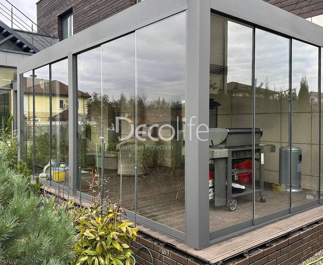 Пергола биоклиматическая Decolife В700-20C + Раздвижное остекление S500 + Вертикальная система Zip 100 - г. Истра