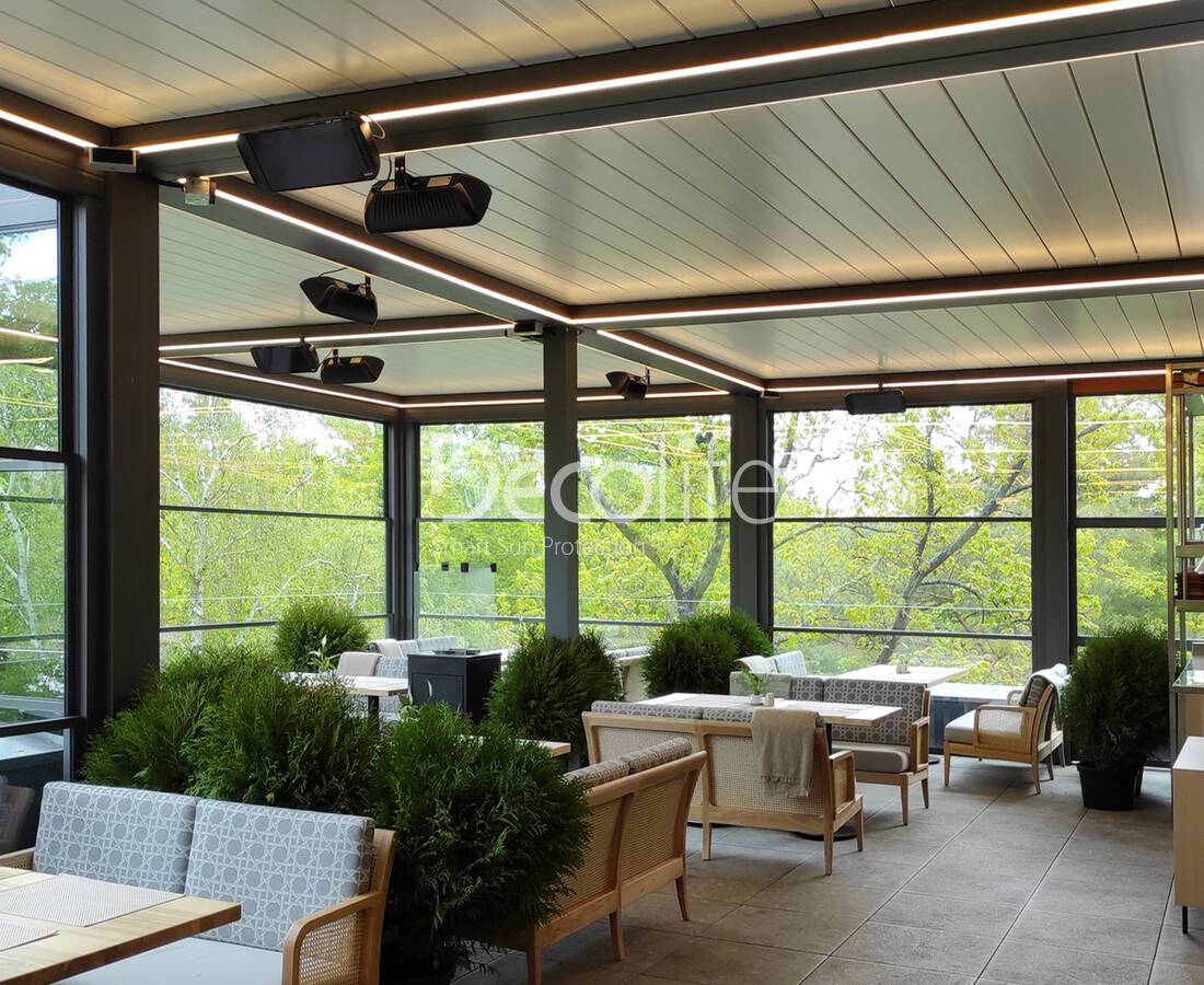 Пергола тентовая Decolife Basic&Pro New + Гильотинное остекление W500 + вертикальная система ZIP 100 - реализовано партнером "ООО Люкс Террас" - Московская обл.